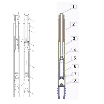 At the up stroke, the plungers rises, the volume of the lower working chamber B increases, the pressure decreases, the Standing valve 8 opens, and the oil and gas enter the chamber B. Meantime,the volume of the upper working chamber A decreases, the oil-gas mixture in chamber A is compressed for a second time, the pressure increases, the upper traveling valve 4 opens, the lower traveling valve 7 closes, and the oil-gas mixture is discharged from the pump through the upper plunger.
